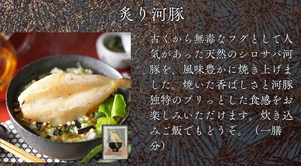 金目鯛、鮭、うなぎ、たらこ、ふぐ、紅ズワイガニ