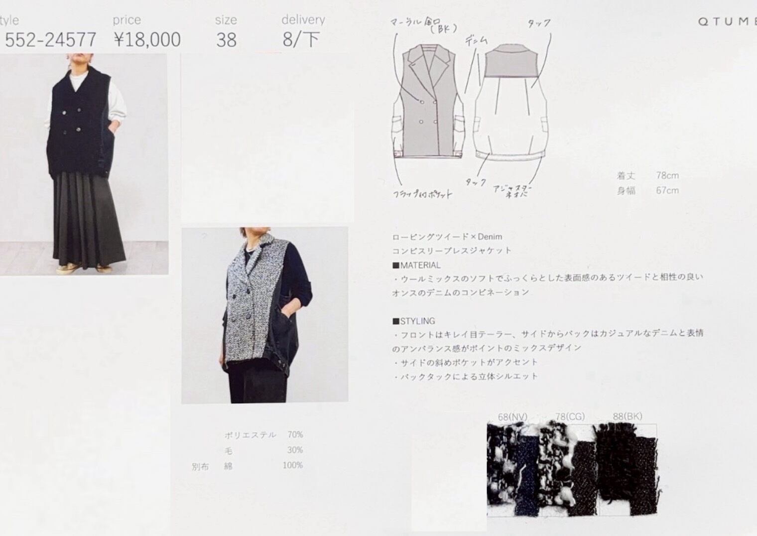 QTUME デニム×ツイードベスト ブラック